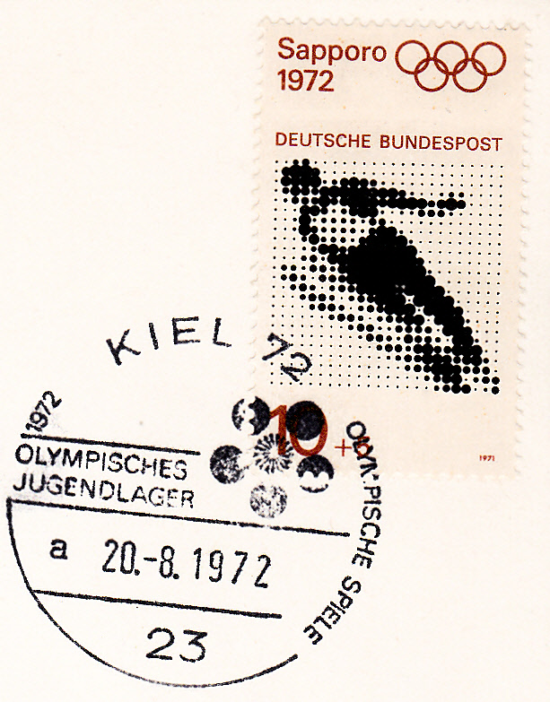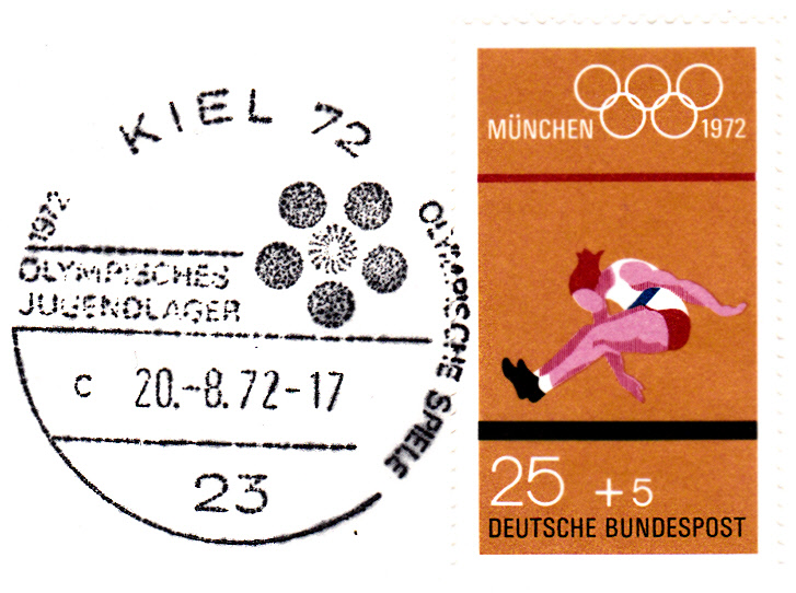 Hier ein Sonderstempel "Olympisches Jugendlager" aus Kiel vom 20.8.1972 ohne Uhrzeit Kennbuchstabe "a".