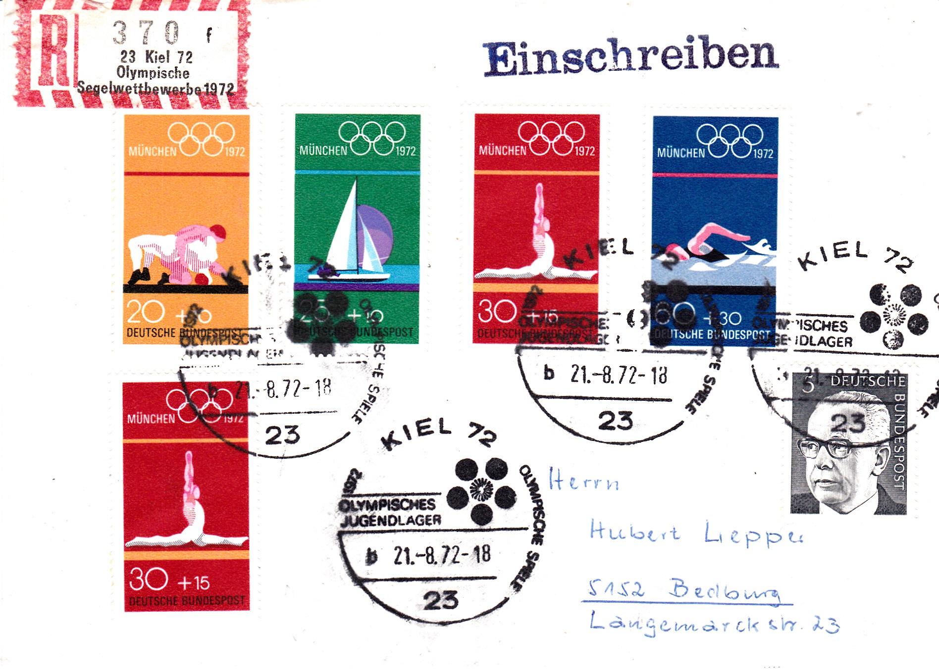 Brief per Einschreiben mit dem Sonder-R-Zettel "23 Kiel 72, Olympische Segelwettbewerbe 1972" und mit dem Sonderstempel "Olympisches Jugendlager" vom 21.8.1972 mit dem Kennbuchstaben "b" und mit Uhrzeit.