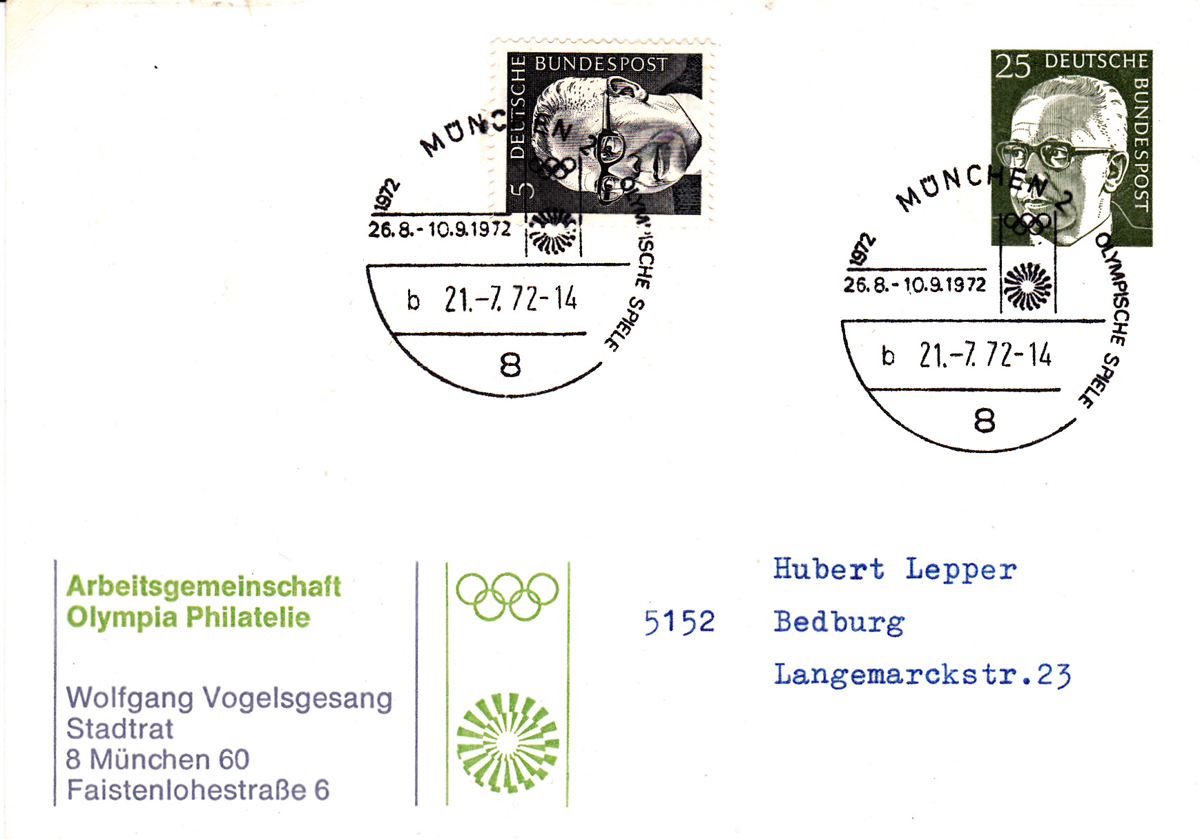 Es folgt der allgemeine Sonderstempel mit Kennbuchstabe "b" mit Uhrzeit auf einer Privatganzsache der Arbeitsgemeinschaft Olympia Philatelie mit Zusatzfrankatur einer 5Pf Heinemannmarke.
