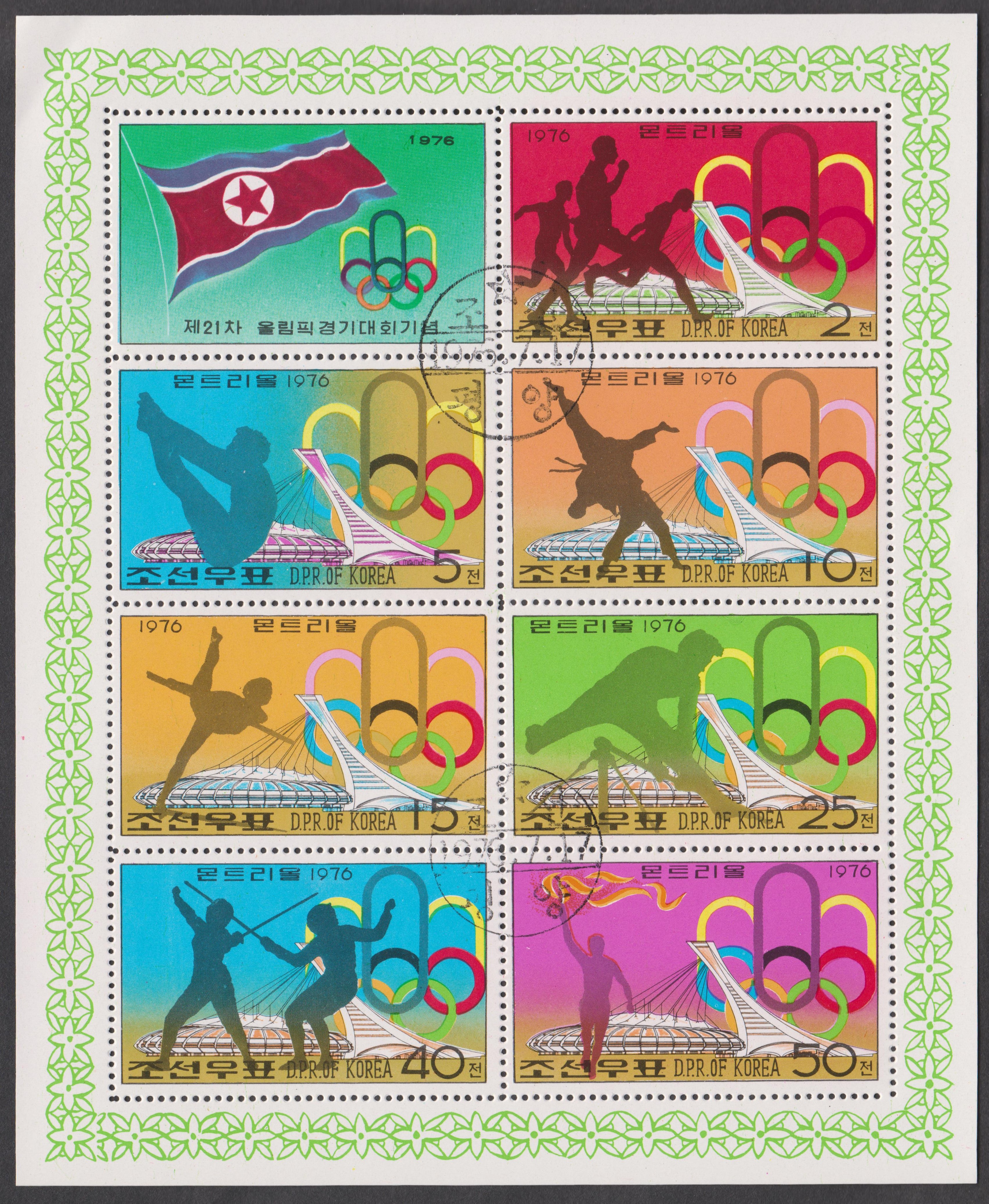 Auf den Postwertzeichen Nordkorea MiNr. 1508 - 1514 ist als Hintergrundmotiv jeweils das Olympiastadion von Montreal zu sehen