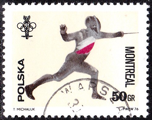 Aus Polen kommt diese Marke (MiNr 2452) mit einem Fechter.