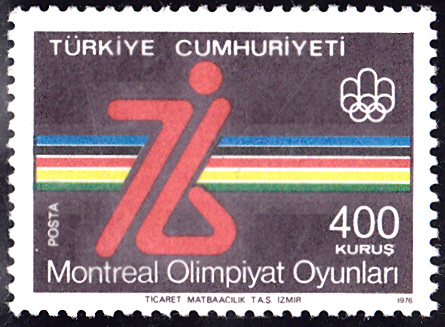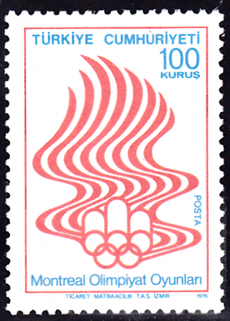 Aus einer Serie aus der Türkei kommt diese Marke (MiNr 2298) mit dem Olympia-Emblem der Spiele in Montreal vor einer stilisierten Flamme.