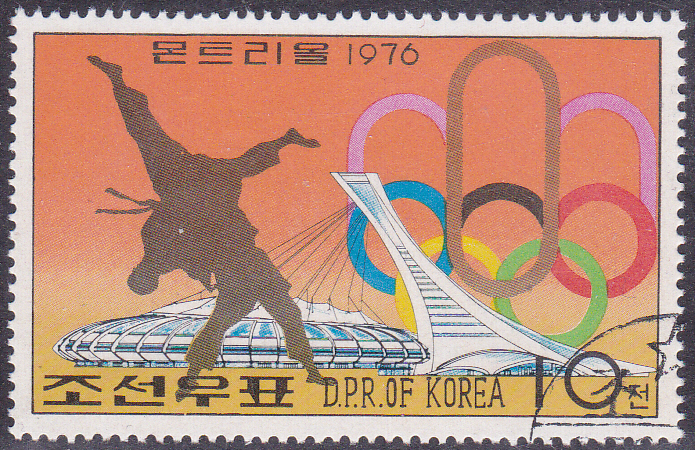 Auf einer weiteren Marke (MiNr 1510 A) sehen wir zwei Sportler beim Judo vor dem Stadion.