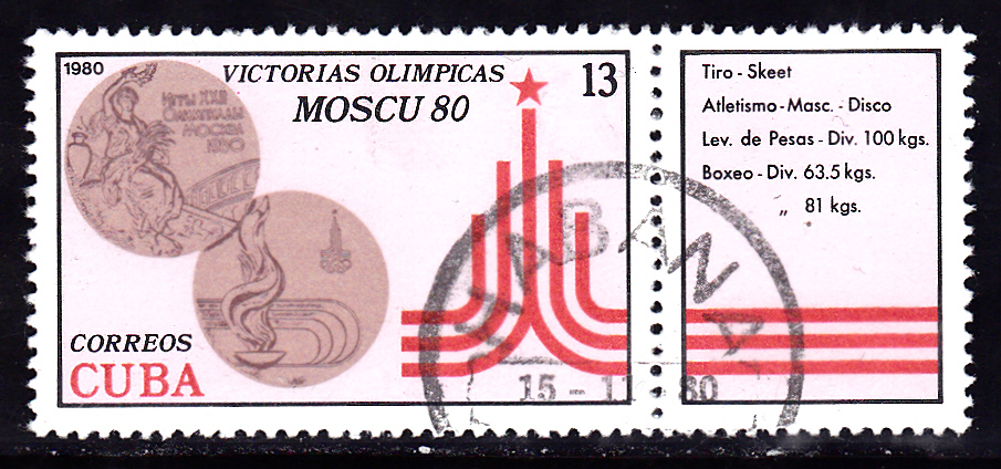 Diese Marke wurde mit einem Zierfeld zusammenhängend gedruckt. Auf dem Zierfeld sind die Disziplinen genannt, in denen kubanische Sportler eine Bronzemedaille erreichten: beim: