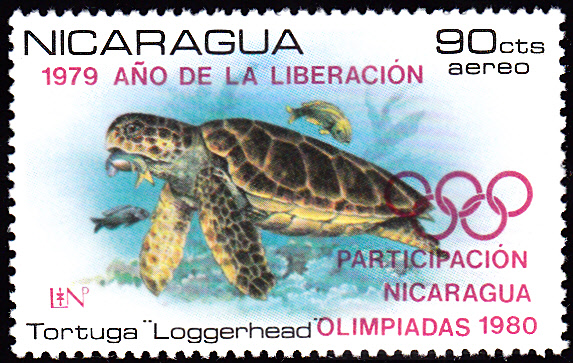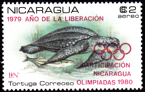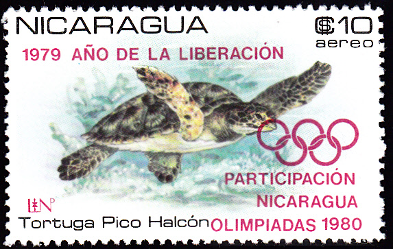 In Nicaragua sind mehrere Serien mit Aufdruck zur Teilnahme Nicaraguas an den Spielen in Moskau erschienen. Hier eine zeige ich den ersten Wert (MiNr 2099) einer vorher nicht ausgegebenen Serie "Geschützte Meerestiere (Schildkröten)" mit rotem Odr.-Aufdruck.