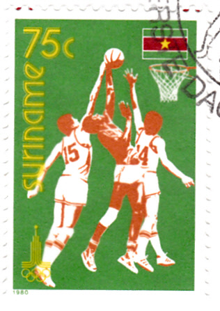 Diese Marke zu 60+25 Cent (MiNr 428 A) mit einer Darstellung zum Basketball komplettiert die Serie.