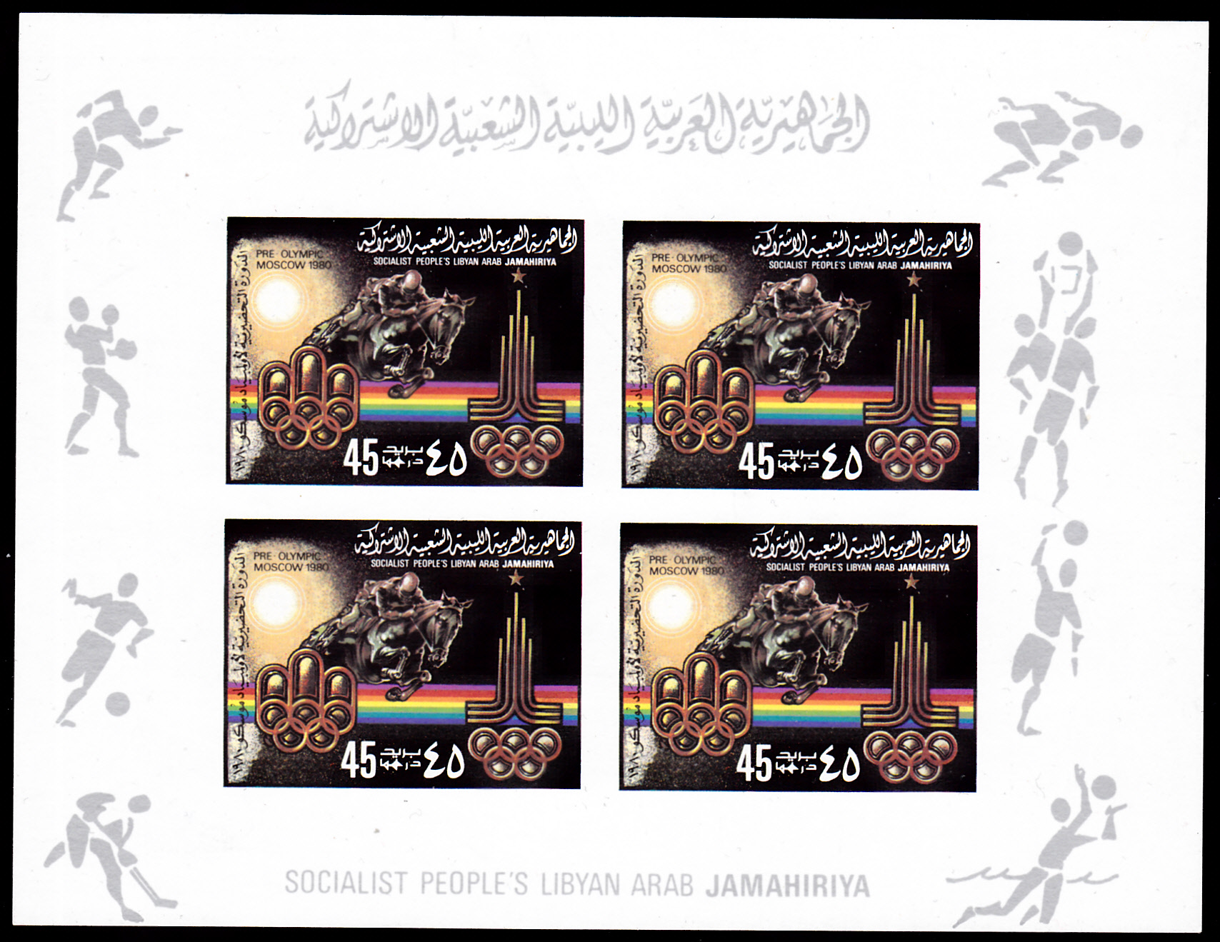 In Libyen sind zu den Olympischen Spielen in Moskau in einer Serie vier Marken. Diese gibt es gezähnt und geschnitten aus Bögen zu 20 Stückmund im Kleinbogen zu vier Marken. Der Bogenhintergrund beim Bogen zu 20 Stück zeigt das Emblem der Olympischen Sommerspiele in Moskau in Silber über die Marken gehend. Die Marken aus dem Kleinbogen zu 20 Stück tragen daher jeweils Teile des silbernen Emblems der Spiele. Die Marken aus den Kleinbogen sind ohne silberne Farbe.
