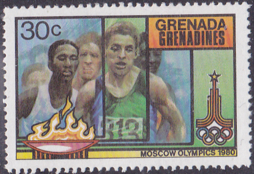 Aus Grenada/Grenadinen kommt diese Marke (MiNr 394) zu den Sommerspielen 1980, Sie zeigt eine Sportlergruppe beim Laufen.