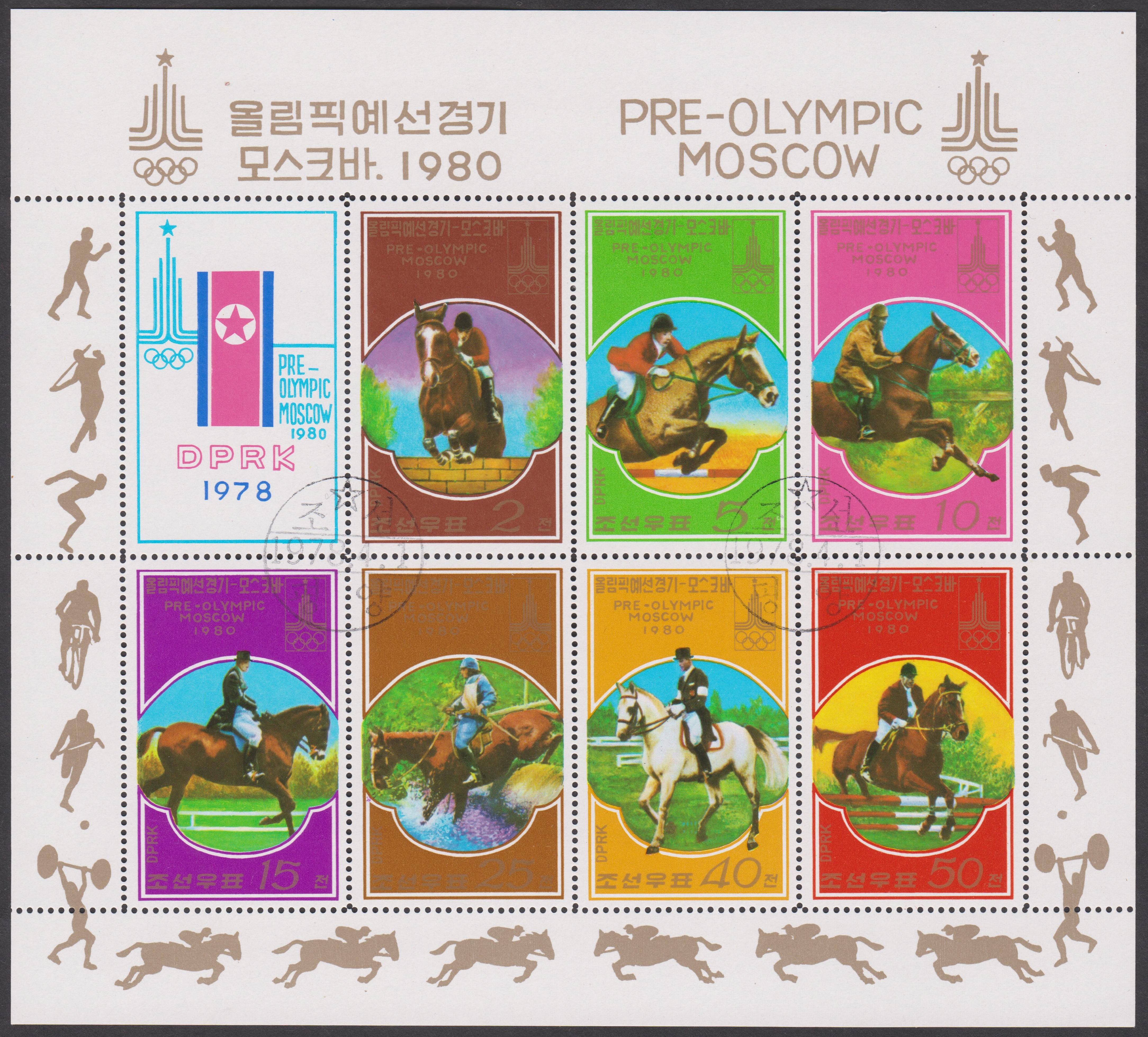 Zum Thema Reitsport bei der Vorolympiade der Sommerspiele Moskau 1980 erschien am 01.04.1978 Nordkorea MiNr. 1707 - 1713 im Kleinbogen mit Zierfeld: