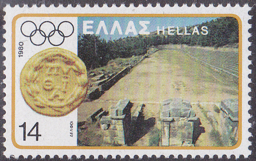 Auf der zweiten Marke der Serie (MiNr 1422) sind das Antike Stadion von Delphi und Münze von Delphi abgebildet. Vom 6. Jahrhundert v. Chr. bis zum 4. Jahrhundert n. Chr. war es Austragungsort der Pythischen Spiele, die im Reigen der Panhellenischen Spiele jeweils im Jahr vor den Olympischen Spielen stattfanden.