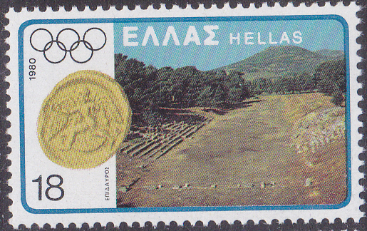 Auch in Griechenland ist ein Markenserie zu den Sommerspielen in Moskau erschienen. Hier zeige ich die Marke zu 8Dr (MiNr 1421) mit dem Antiken Stadion von Olympia und einer Münze von Elis. Das antike Elis mit der gleichnamigen Hauptstadt hatte im Altertum die Aufsicht über die Olympischen Spiele, hier trainierten die Athleten, bevor sie in Olympia zum Wettkampf antraten.