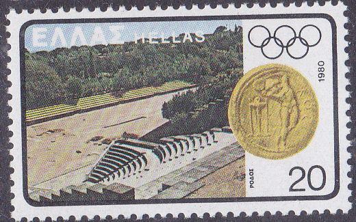 Diese Marke (MiNr 1425) mit dem Olympiastadion von Athen und einer Medaille der 1. Olympischen Spiele (1896) der Neuzeit vervollständigt diese Serie aus Griechenland.