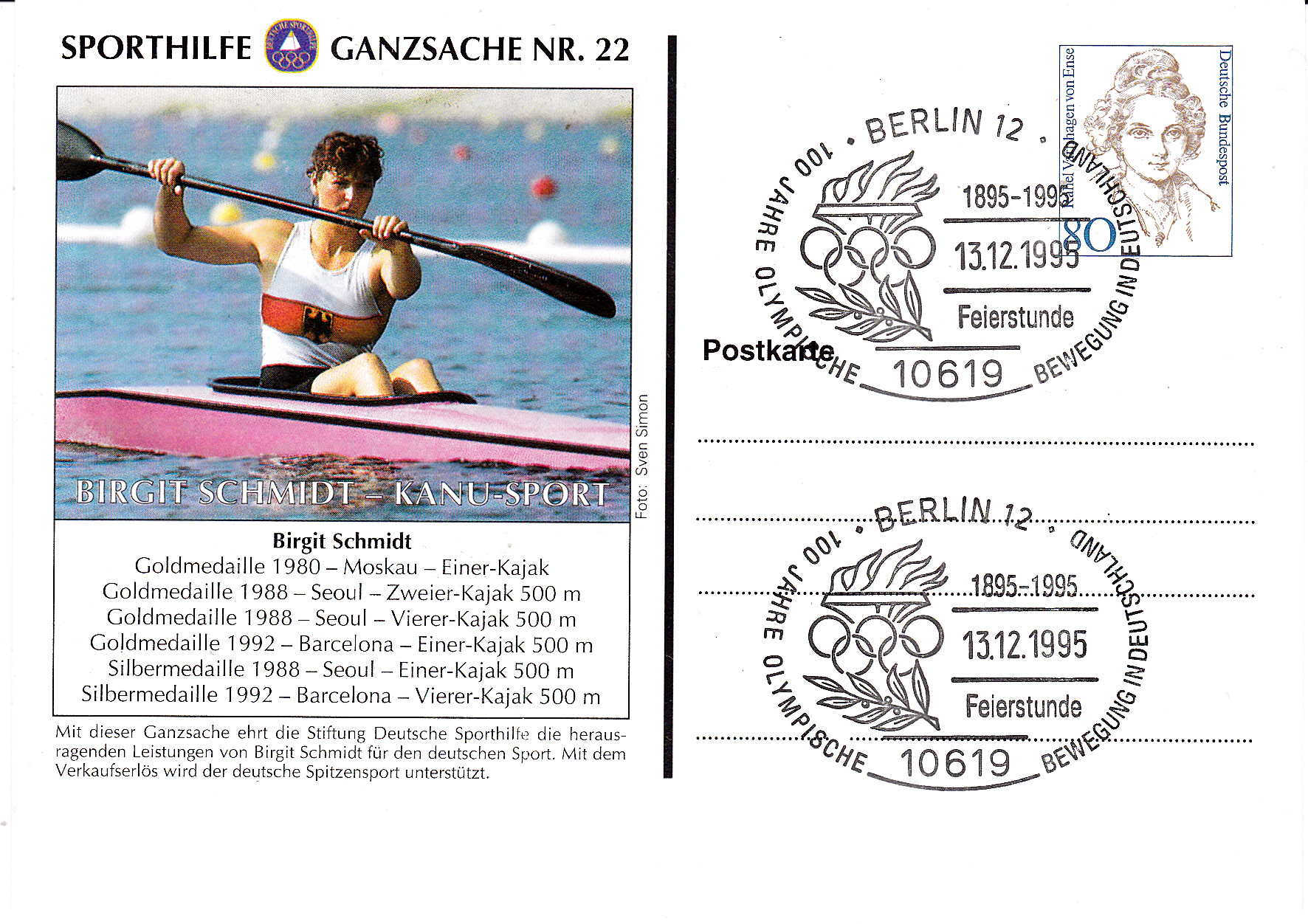 Ganzsache der Deutschen Sporthilfe, die die Olympiaerfolge der Jahre 1980 bis 1992 würdigt. Leider ist die Ganzsache nicht echt gelaufen.