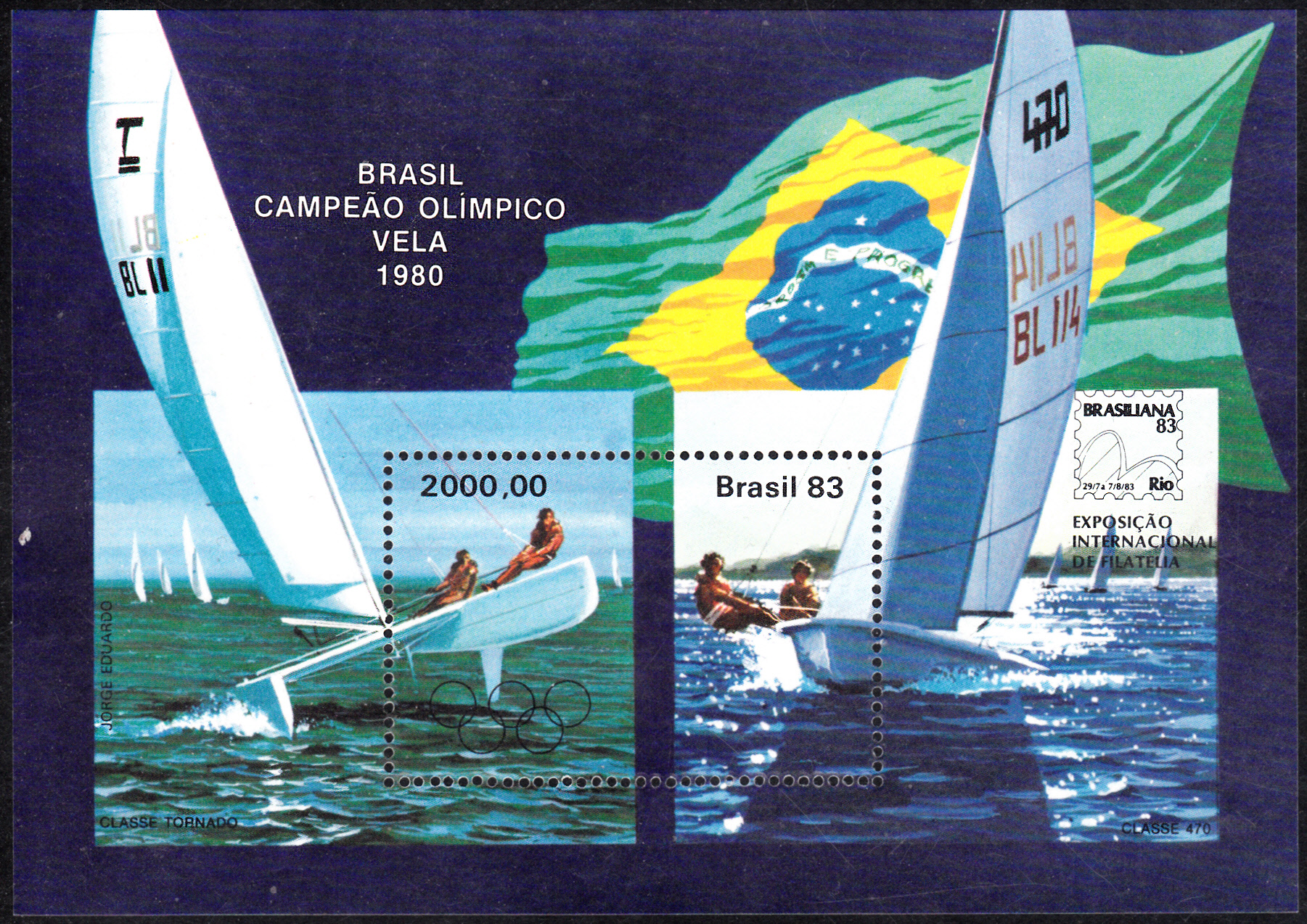 Zur Briefmarkenausstellung "BRASILIANA 83" erschien auch dieser Block (MiNr Block 58), der auf der linken Seite die Olympiasieger bei einer Regatta zeigt.