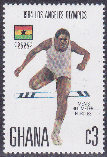 Aus Ghana kommt diese Marke zu den Sommerspielen 1984 (MiNr 1048) mit einer Läuferin, laut Beschriftung beim 400m-Lauf.