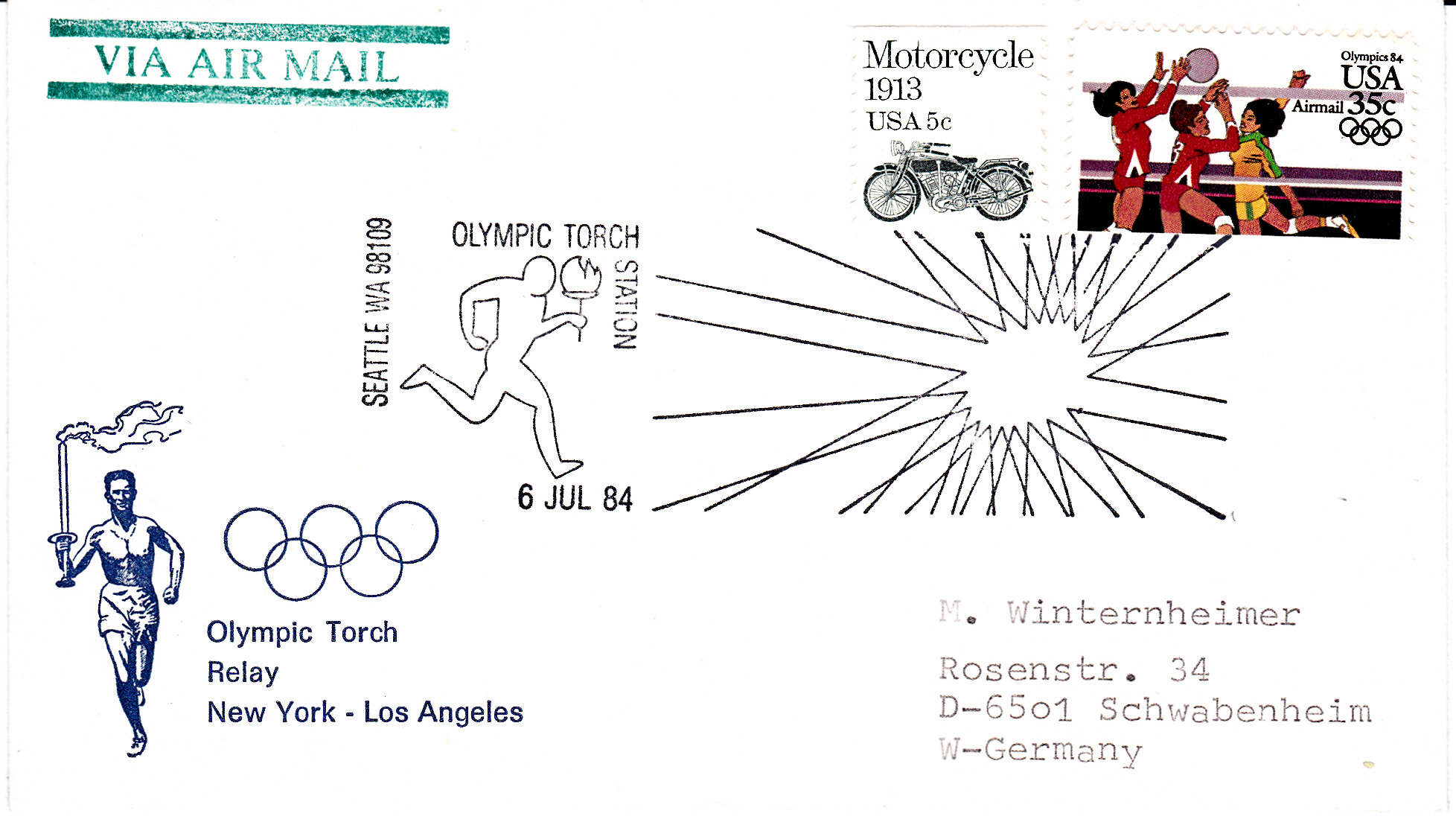 Am 6.6.1984 liefen die Fackelläufer durch die Stadt St. Louis, wie man an diesem Brief mit Luftpost nach Deutschland erkennen kann.