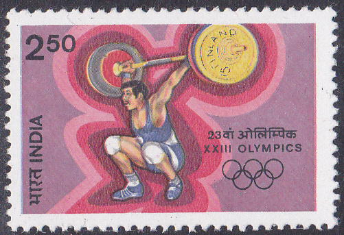 Die vierte und letzte Marke (MiNr 997) der indischen Serie zu den Spielen 1984 bildet einen Gewichtheber ab.