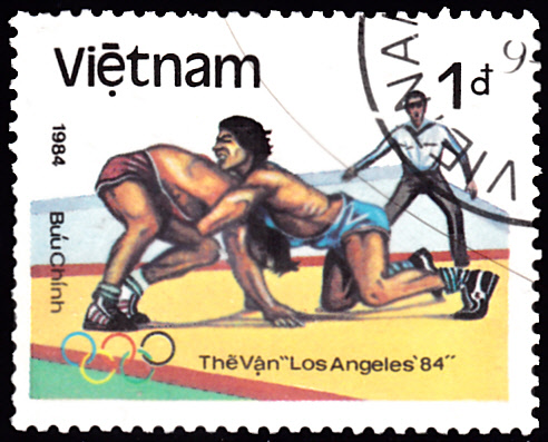Diese Marke aus Vietnam (MiNr C 1451) zu den Sommerspielen in Los Angeles 1984 zeigt eine Szene beim Ringen.