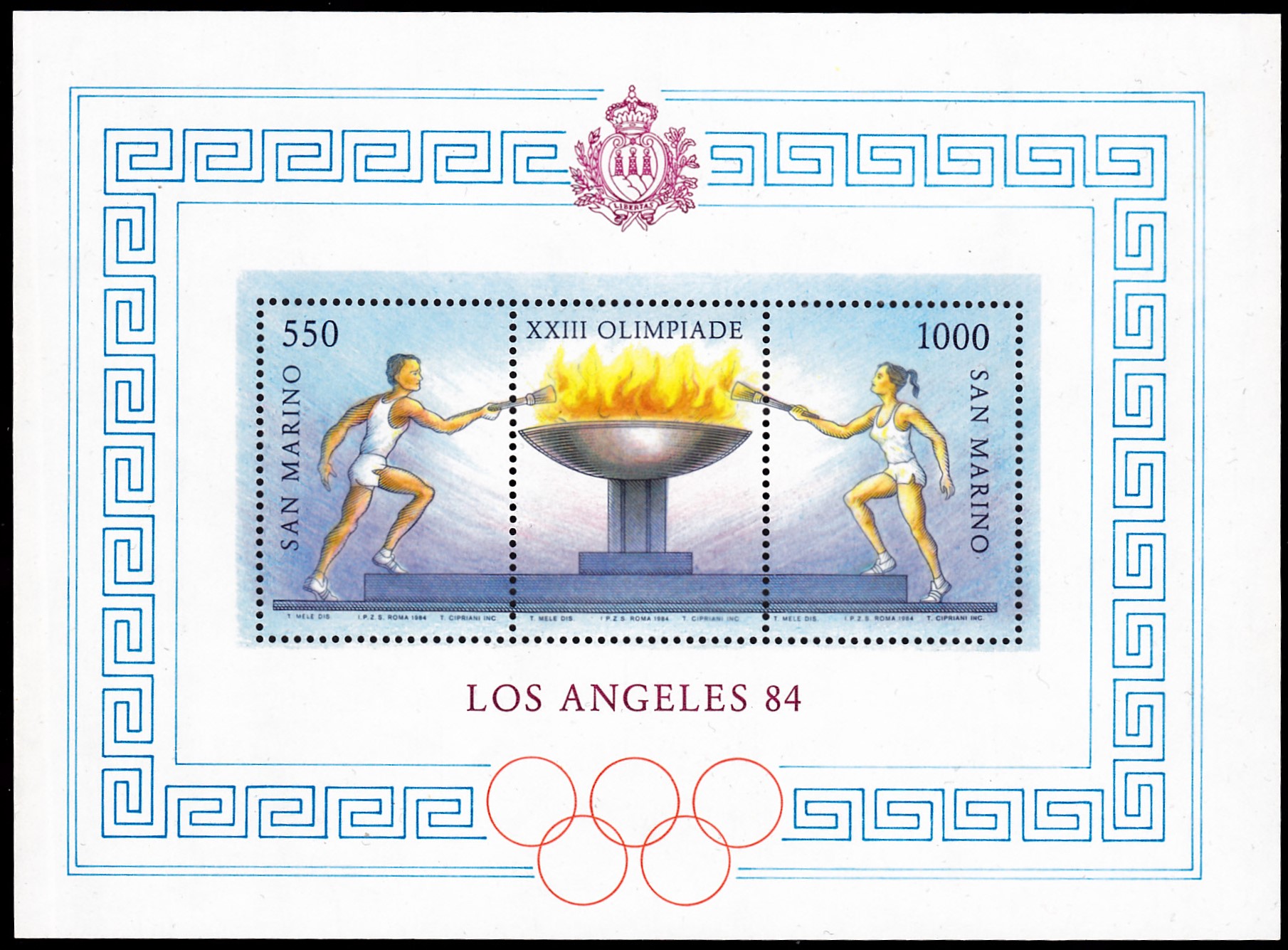 In San Marino ist zu den Olympischen Spielen 1984 in Los Angeles eine Blockausgabe mit zwei Marken und einem Zierfeld erschienen (MiNr Block 9 mit den Marken MiNr 1298/1299) erschienen. Die beiden Marken zeigen einen Fackelträger und eine Fackelträgerin beim Zünden der Olympischen Flamme auf dem Zierfeld.