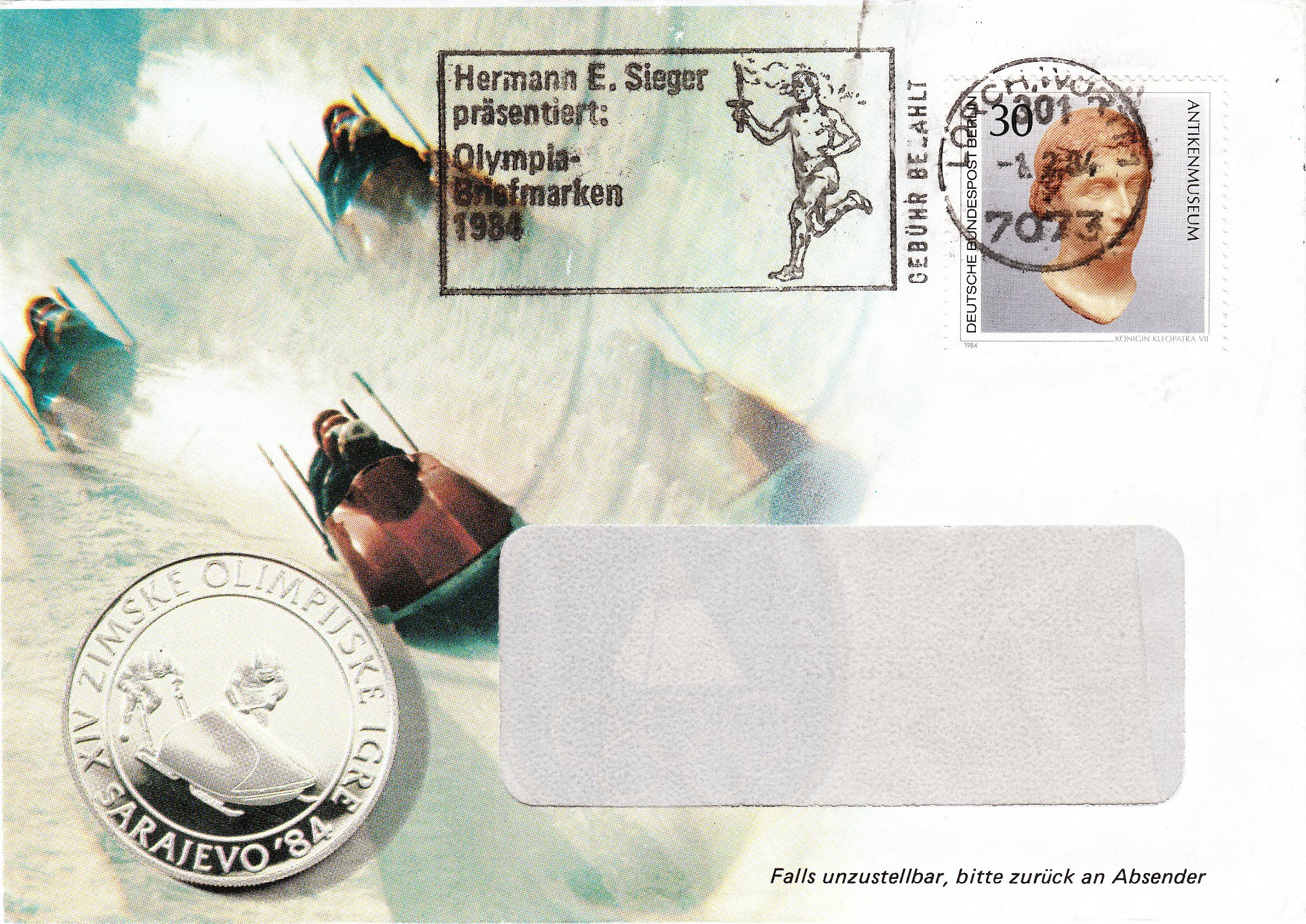 Die Firma Sieger präsentierte am 01.02.1984 die Olympia-Briefmarken 1984 mit einem Fackelläufer im Werbeeinsatz ihres Absenderstempels: