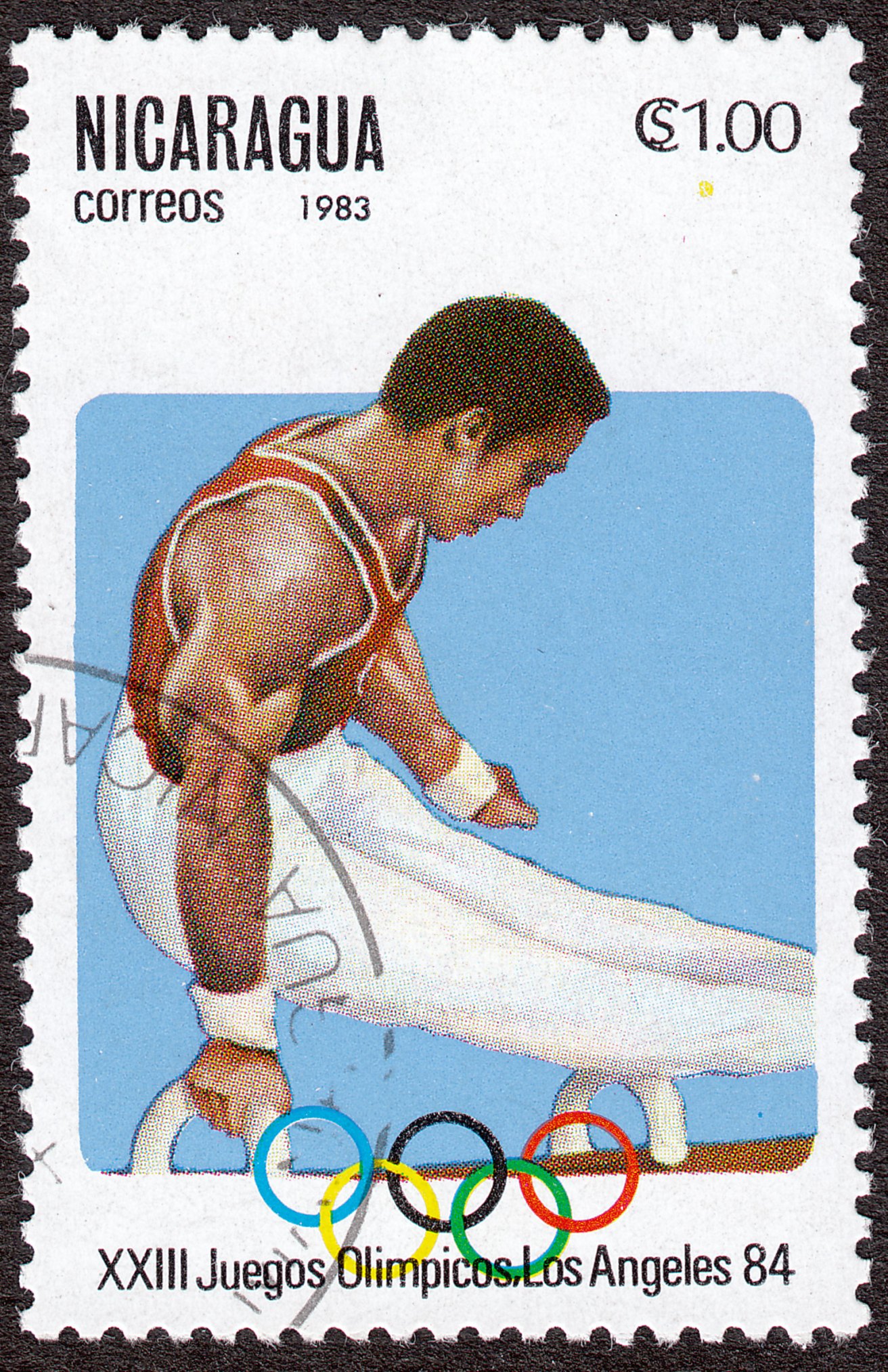 Hier ein Turner auf einer Briefmarke aus Nicaragua, MiNr. 2347, die aus Anlaß der Olympiade erschien, die 1984 in Los Angeles stattfand: