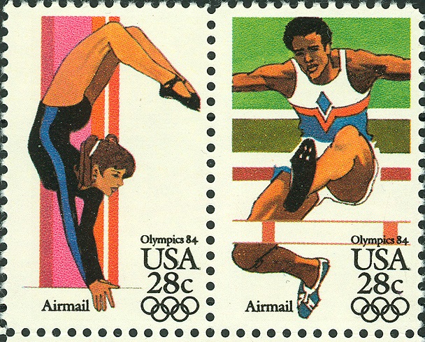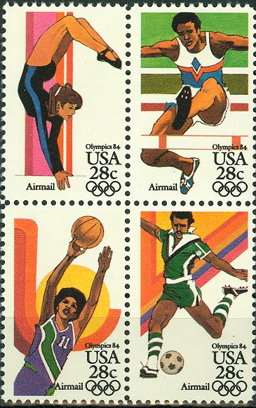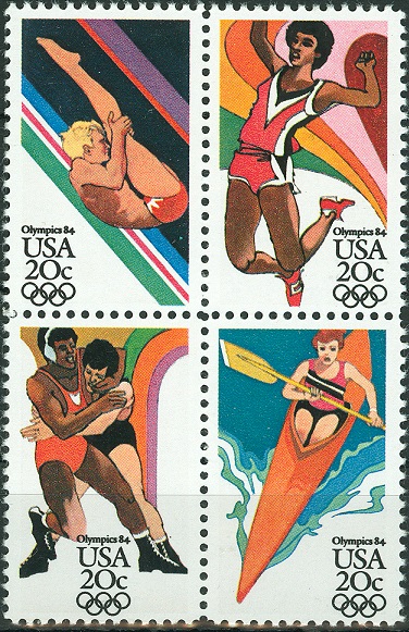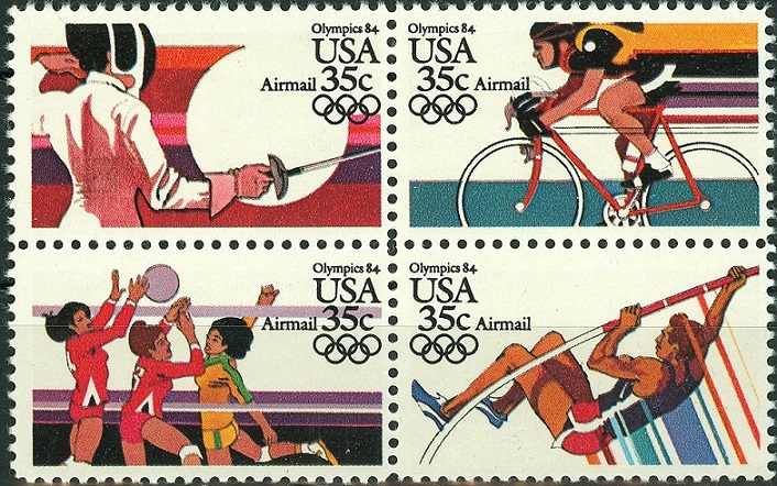 Die US-amerikanische Postverwaltung gab zu den Sommerspielen einige graphisch sehr interessant gestaltete Marken in Vierer-Zusammendrucken gleicher Wertstufen heraus.