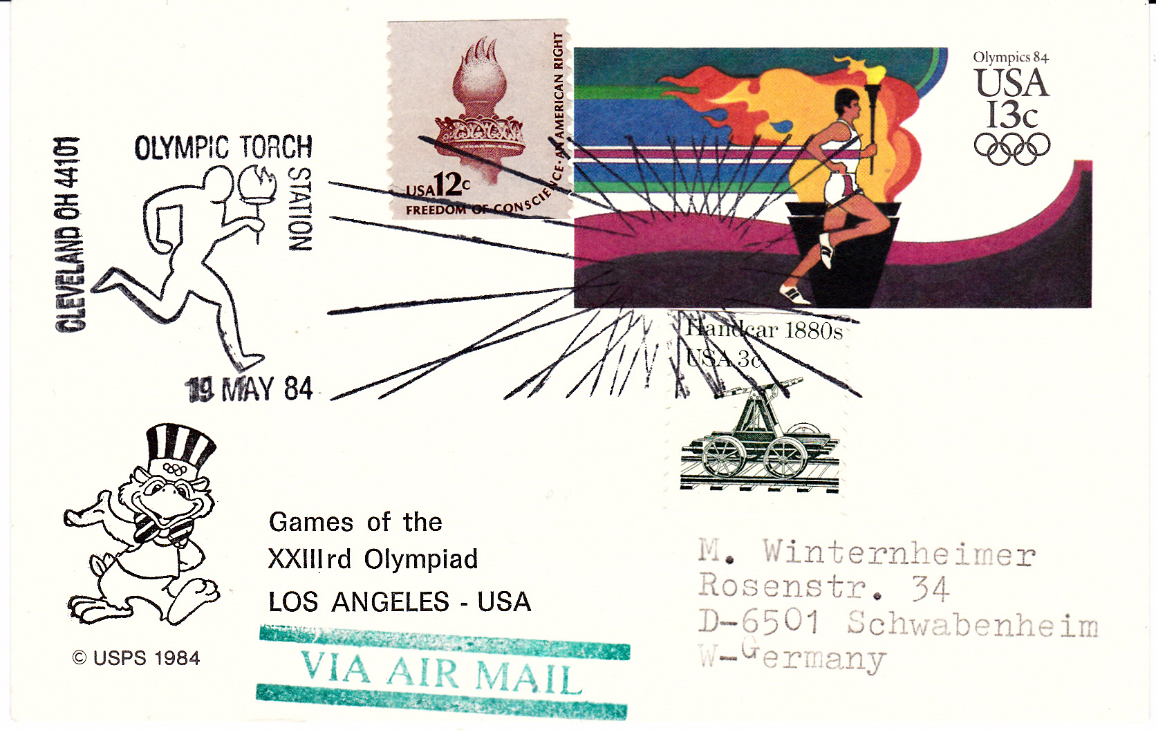 Am 19.5.1984 erreichte der Fackellauf Cleveland (Ohio), wie der Sonderstempel auf dieser Ganzsache nach Deutschland beweist.