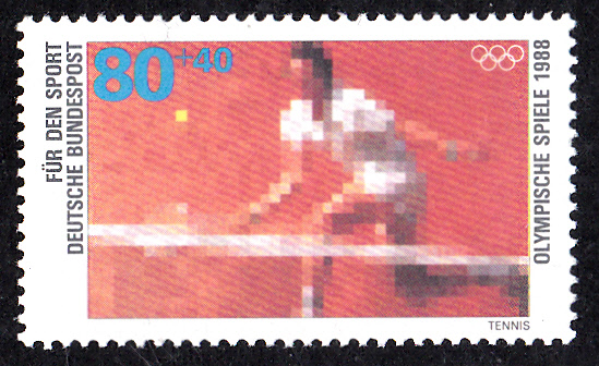 In der Serie für die Sporthilfe erschien zu den Spielen in Seoul auch diese Marke zu 80+40Pf (MiNr 1354) mit der Abbildung eines Tennisspielers.