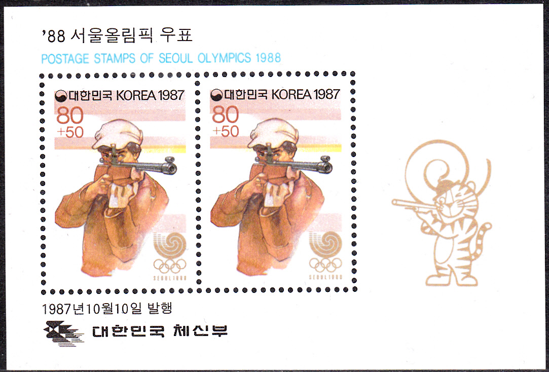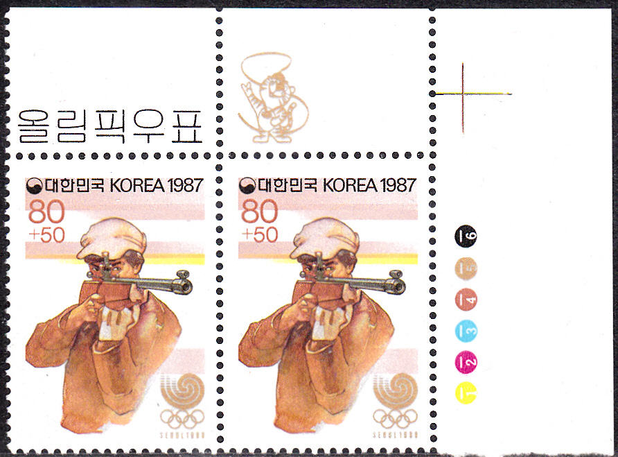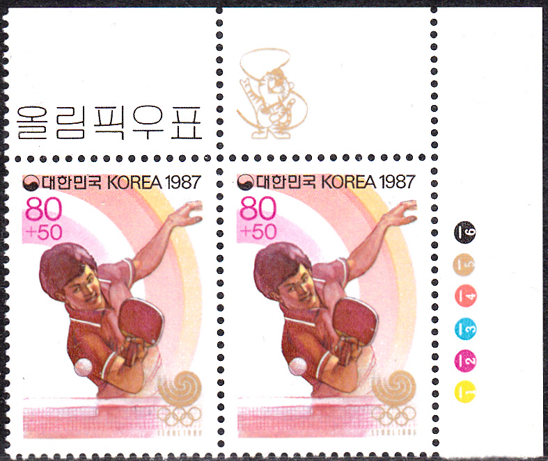Am 10. Oktober 1987 erschien in Korea-Süd eine weitere Serie zu den Olympischen Spielen 1988 in Seoul. Diese Marke (MiNr 1541) ist der Sportart Tischtennis gewidmet. Hier ein Paar vom rechten oberen Bogenrand mit dem Maskottchen der Spiele oberhalb der rechten Marke.