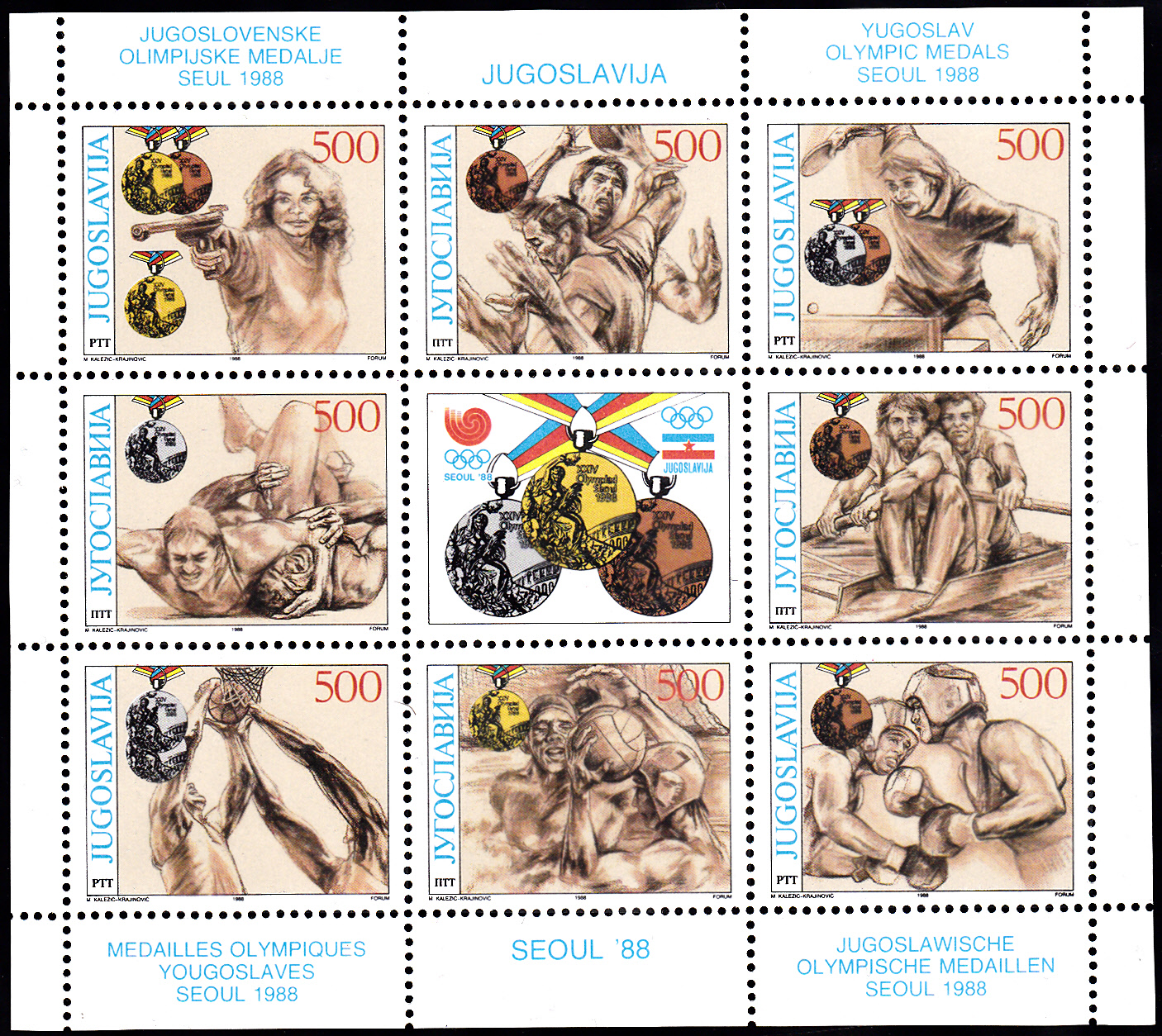 Die beiden zuletzt gezeigten Marken der Goldmedaillengewinner aus Jugoslawien erschienen zusammen mit weiteren Marken der Jugoslawischen Silber- und Bronzemedaillengewinner als Zusammendruck in einem Kleinbogen mit einem Zierfeld in der Mitte.
