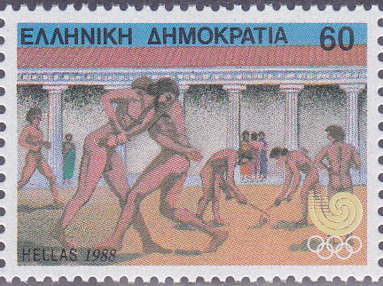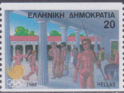 Auf der zweiten Marke der Serie (MiNr 1688) sind Athleten im Gymnastirio abgebildet.