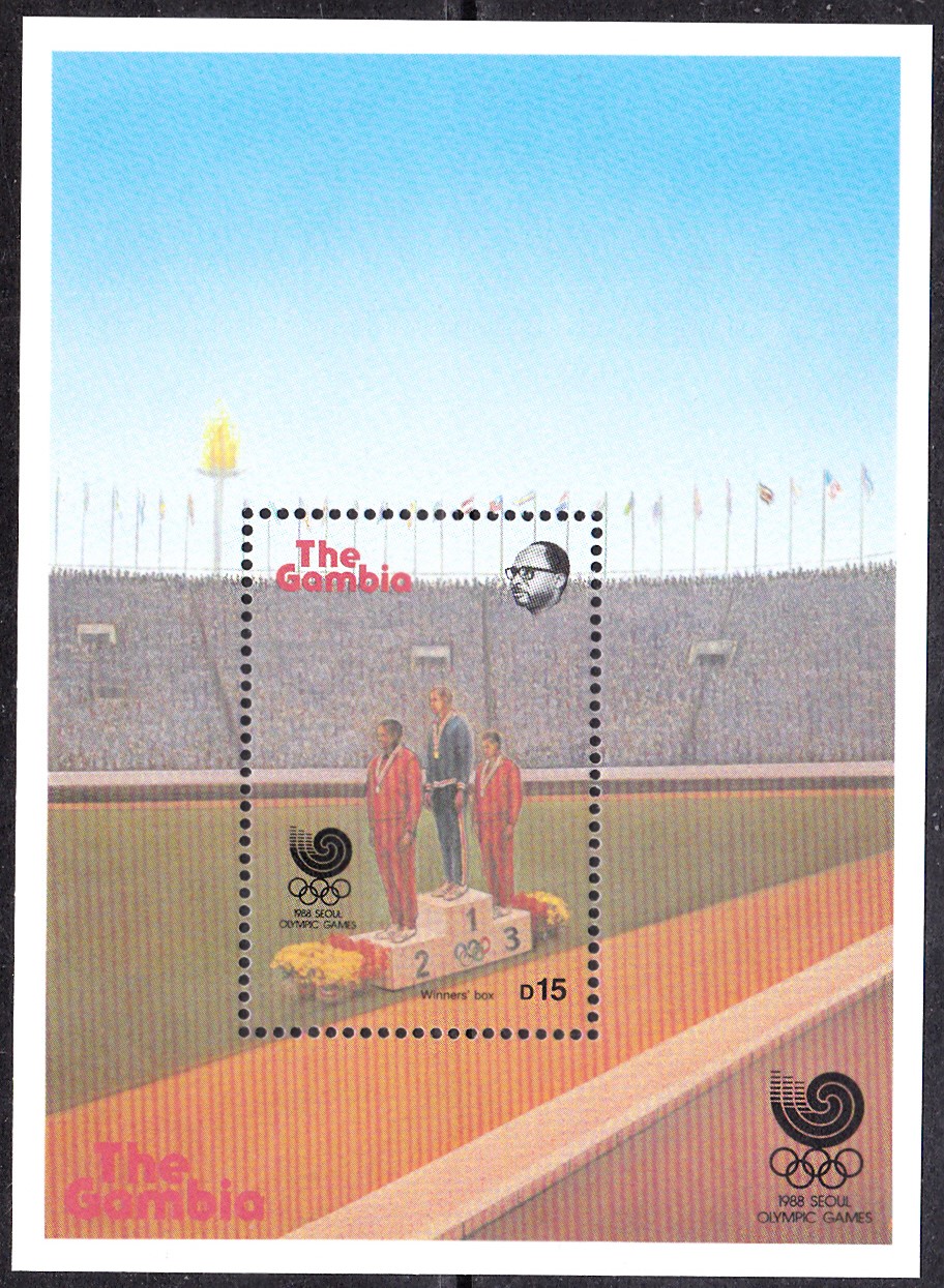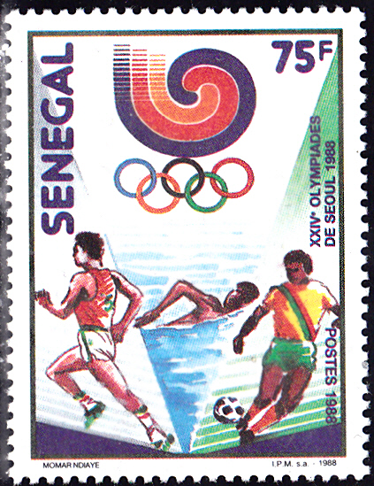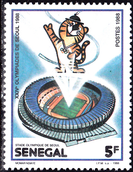 Aus der Serie aus dem Senegal zeuge ich hier die Marke zu 5 Fr (MiNr 983) mit dem Olympiastadion in Seoul und dem Maskottchen Hodori.