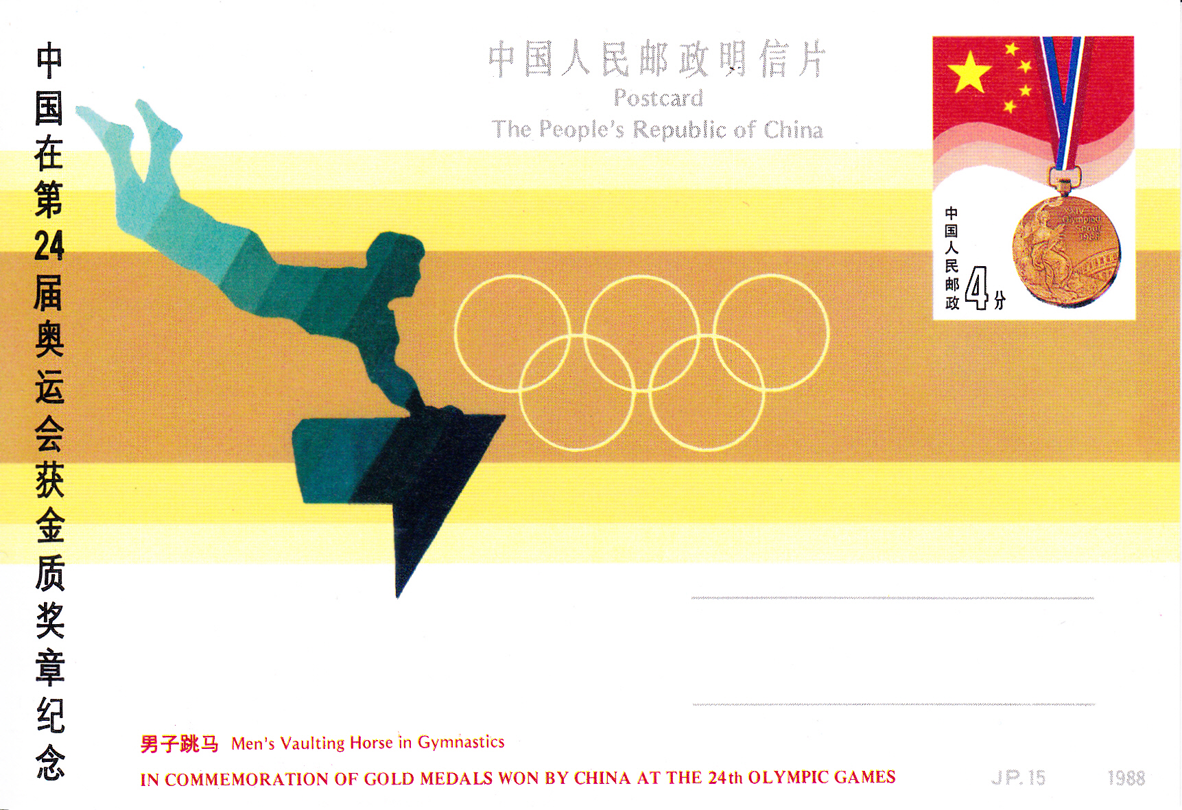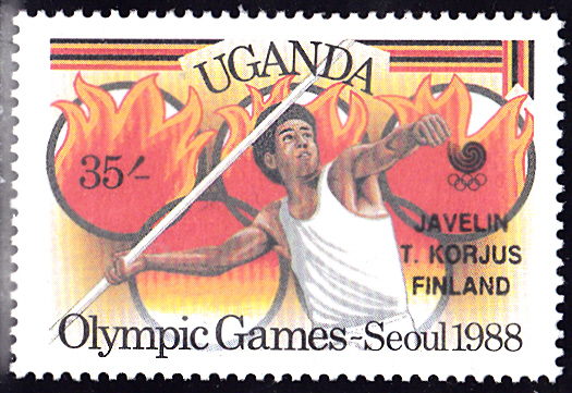 Auf dieser Marke (MiNr 641) aus Uganda wird im Aufdruck zum Sieg von Carl Lewis im Weitsprung bei den Spielen in Seoul hingewiesen.