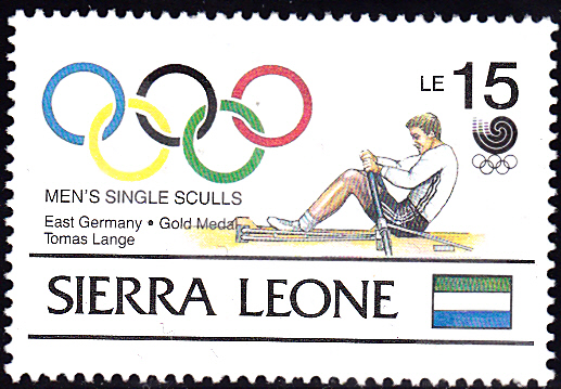 Dieser Block aus Sierra Leone (MiNr Block 97 mit Marke MiNr 1173) würdigt die hier schon erwähnte Goldmedaillengewinnerin beim Fechten im Florett Einzel Anja Fichtel.