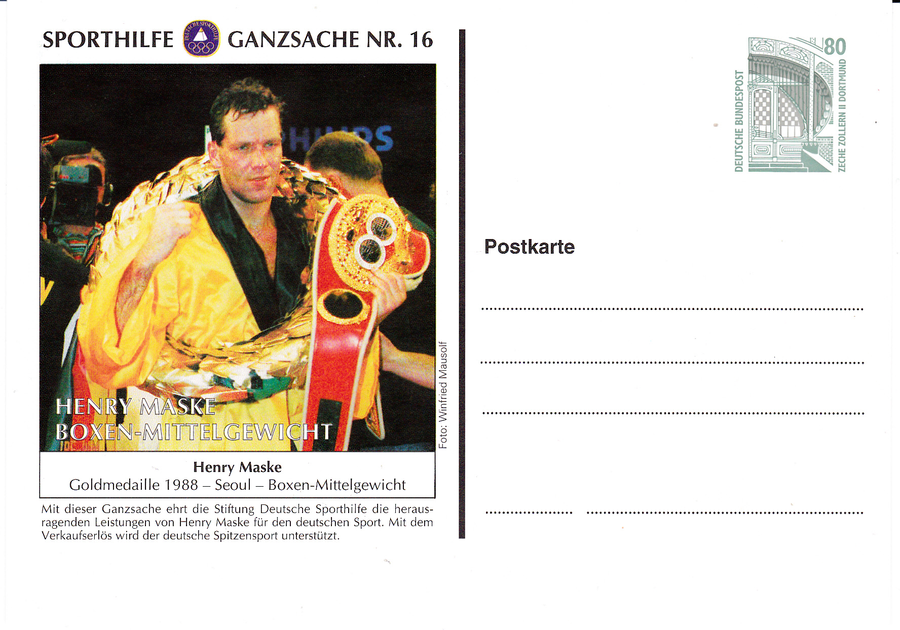 Ganzsache der Stiftung Deutsche Sporthilfe mit einer Abbildung von Henry Maske.