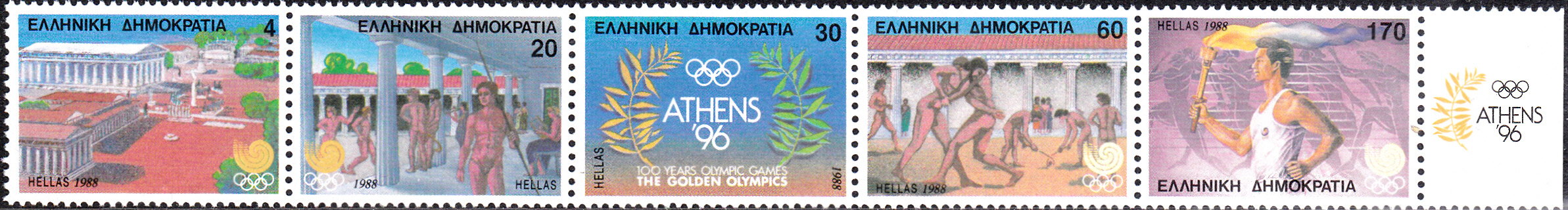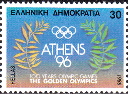 In der Briefmarkenserie Griechenlands zu den Olympischen Spiele 1988 wurde bereits eine Marke dem Thema "100 Jahre Olympische Spiele der Neuzeit" und hier speziell der Bewerbung Athens für die Spiele 1996. Die Marke mit der MiNr 1689 zeigt als Motiv Lorbeerzweige und die Olympischen Ringe. Die Marke gibt es in drei Variationen: 1689 A gez. K 14:12, 1689 C nur senkrecht gez. 12, 1689 D nur senkrecht gez. 14. Hier zeige ich die MiNr 1689 D.