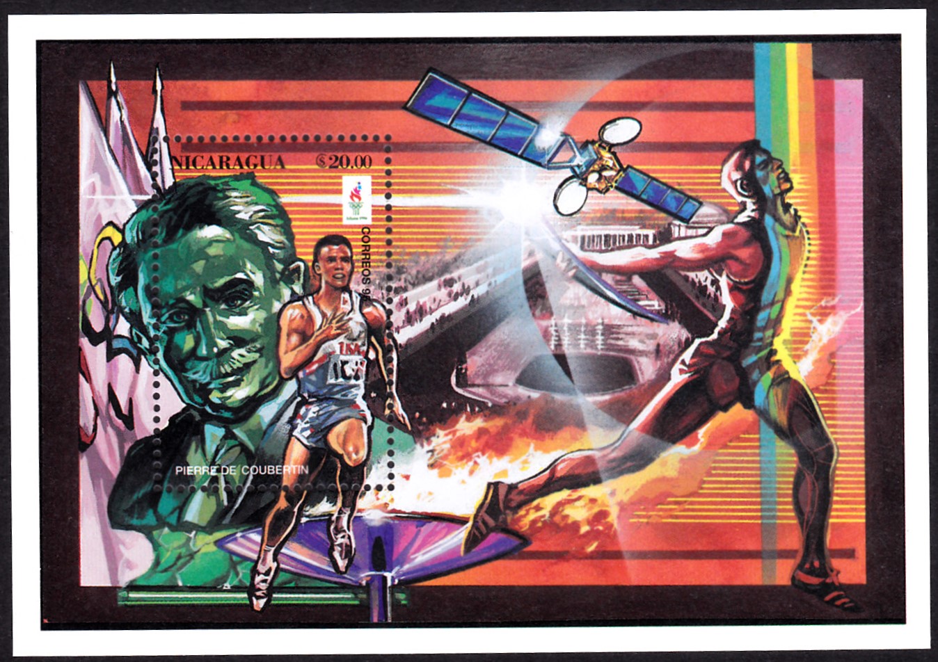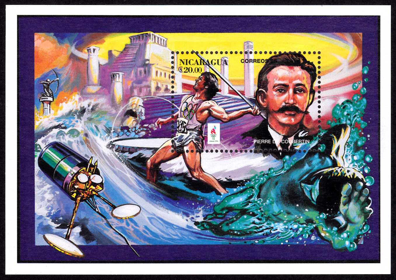 Zu dieser Ausgabe aus Nicaragua gehört auch dieser Block (MiNr Block 244 mit Marke 3640). Das Markenbild zeigt ein Porträt von Pierre de Coubertin und einen Speerwerfer.