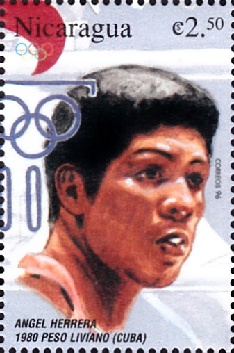 Armando Martínez, 1980 Olympiasieger im Halbmittelgewicht, zeigt diese Marke der gleichen Serie aus Nicaragua (MiNr 3782).