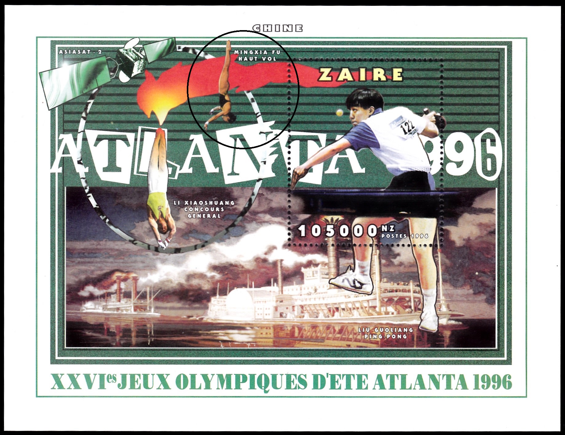Dieser Block zeigt auf dem Blockrand auch den bereits hier vorgestellten Olympiasieger beim Kunstturnen, Li Xiaoshuang (siehe Markierung).