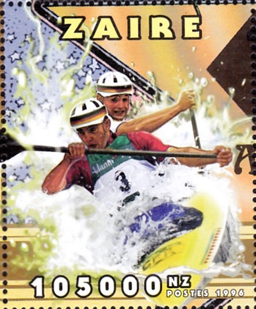 Diese Marke (MiNr 1189) in einem weiteren Block (MiNr Block 64) aus Zaire gibt mir Rätsel auf. Gemäß Beschriftung auf dem Blockrand sollen hier Olympiasieger aus Deutschland gezeigt werden. Das Bild der Marke zeigt einen Zweier-Kanadier beim Kanu-Slalom. In dieser Disziplin hat aber ein französisches Duo gewonnen. Im Einer-Kajak beim Kanu-Slalom war Oliver Fix aus Deutschland Olympiasieger.