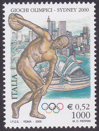 Auf der zweiten Marke aus Italien (MiNr 2717) werden ein Altgriechischer Diskuswerfer, das Opernhaus und die Stadtsilhouette von Sydney gezeigt.