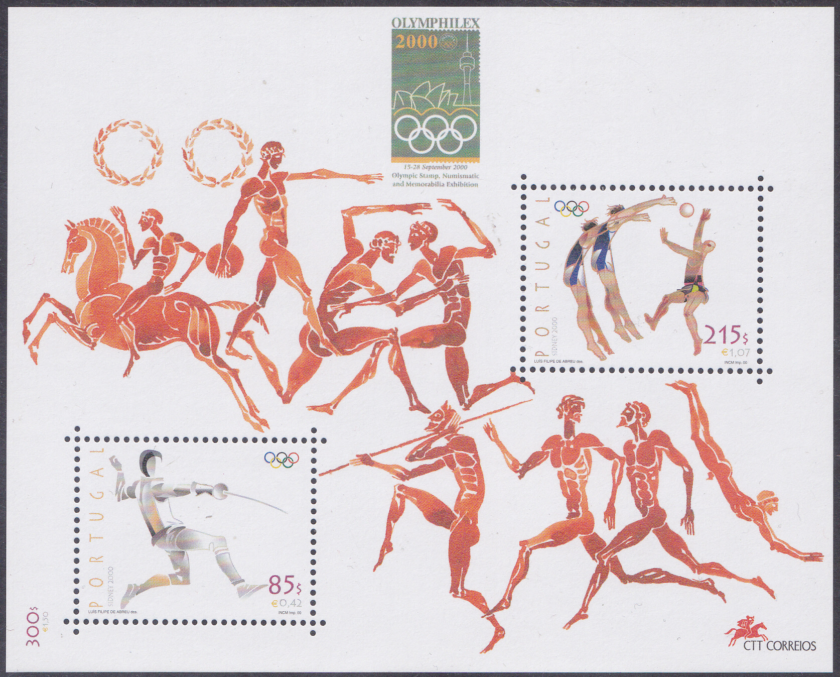 Zu dieser Serie aus Portugal gehört auch noch eine Blockausgabe (MiNr Block 164) mit zwei Marken. Auf der einen Marke (MiNr 2459) wird ein Fechter gezeigt, auf der anderen (MiNr 5460) sind Volleyballspieler zu sehen.