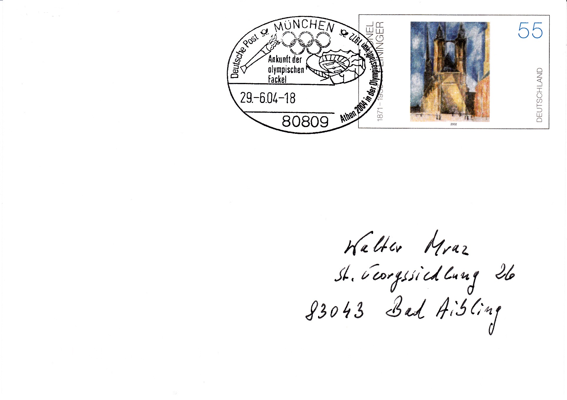 Der Olympische Fackellauf 2004 war der längste Fackellauf der Geschichte. Er führte rund um die Welt in alle Erdteile und besuchte alle bisherigen Olympiastädte. So erreichte er am 29.6.2004 auch München, wie dieser Sonderstempel belegt.