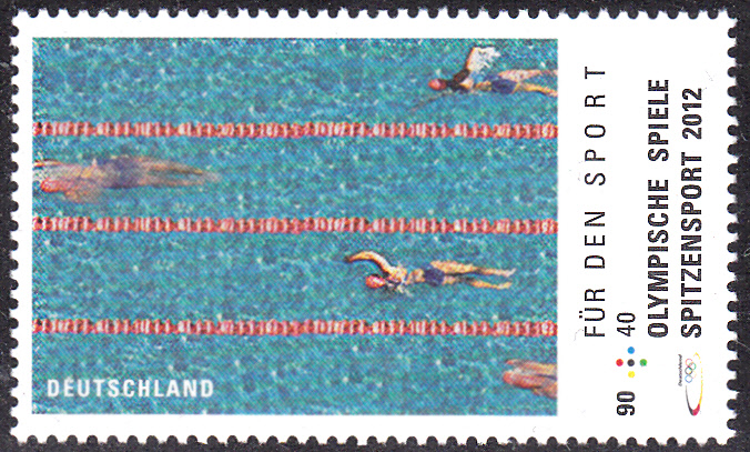 Im Rahmen der Serie "Für den Sport" erschien auch eine Marke zu den Olympischen Spielen 2012 in London. Sie zeigt vier Bahnen mit Schwimmern bei einem Wettkampf.