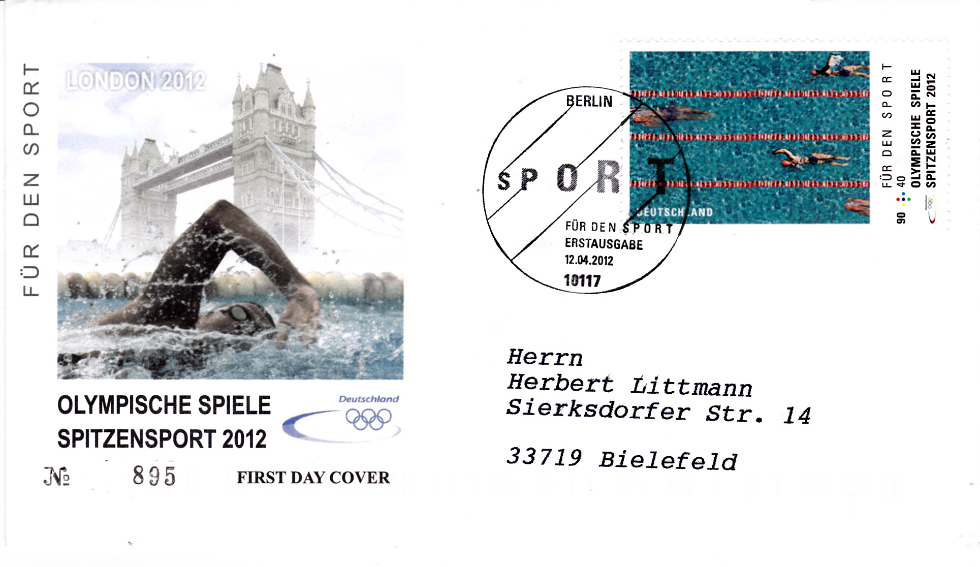 Gelaufener Ersttagsbrief der Marke zu den Olympischen Spielen 2012 mit dem Ersttagsonderstempel Berlin.