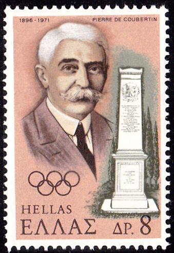 Die zweite Marke aus Griechenland (MiNr 1073) zeigt ein Porträt von Pierre de Coubertin (1863-1937) und eine Gedenksäule in Olympia.