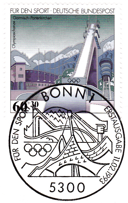 Auf dieser Marke aus der Serie "Für den Sport" 1993 der Deutschen Bundespost (MiNr 1650) und im oberen Teil des dazu passenden Ersttagsonderstempel wird jeweils die Skisprungschanze bei den Olympischen Winterspielen 1936 in Garmisch-Partenkirchen abgebildet.