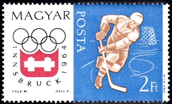 Aus der Ausgabe der Tschechoslowakei zu den Winterspielen 1964 kommt diese Marke (MiNr 1447) ,ot eine Spielszene beim Eishockey.