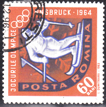 Ergänzend zu den drei bereits von Rüdiger gezeigten Marken aus Rumänien stelle ich hier ein paar weitere Werte aus der Serie zu den Winterspielen 1964 vor. Hier die Marke zu 20 Bani (MiNr 2196) mit einem Eisschnellläufer im Markenbild