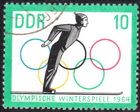 In der DDR erschien zu den Olympischen Winterspielen 1964 eine Serie, die sich mit dem Skispringen befasste. Hier die Marke zu 5 Pfennige (MiNr 1000) mit einem Skispringer beim Anlauf.